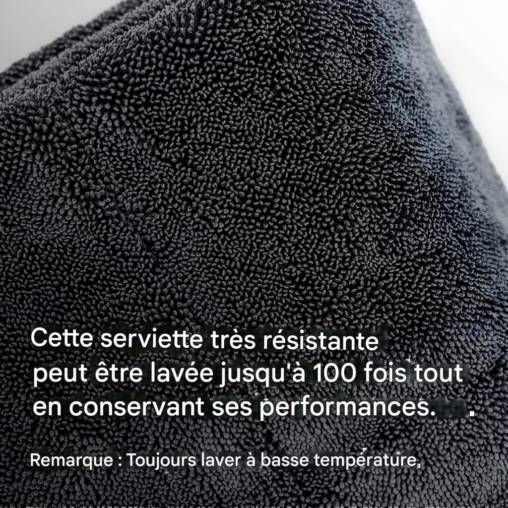 Mode d’Emploi : Lavez à l’eau tiède pour la première utilisation. Utilisez sèche pour sécher ou humide pour nettoyer en mouvements circulaires. Essorez l’excès d’eau, rincez après usage et accrochez pour sécher. Lavez en machine à 40°C max sans assouplissant.
