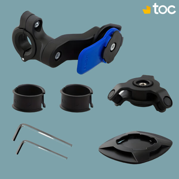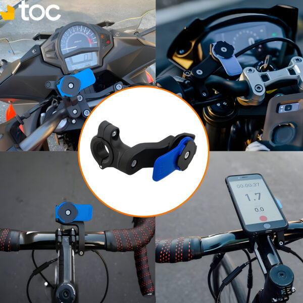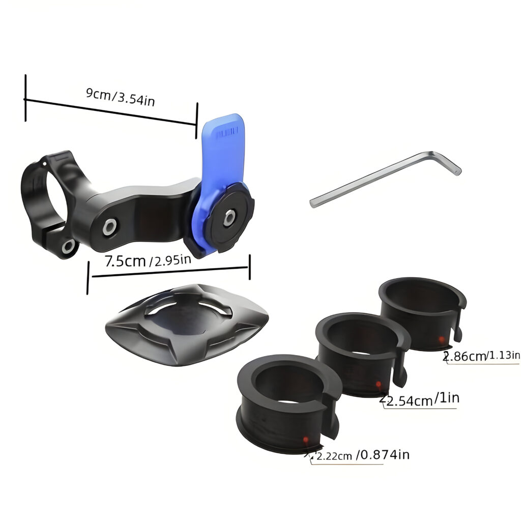 Compatibilité et Options de Montage : Il propose plusieurs configurations de montage, s’adaptant aux barres de 7/8” (22 mm), 1” (25 mm), 1-1/8” (28 mm) et 1-1/4” (32 mm). De plus, il est compatible avec tous les boîtiers Quad Lock et les adaptateurs universels (inclus).