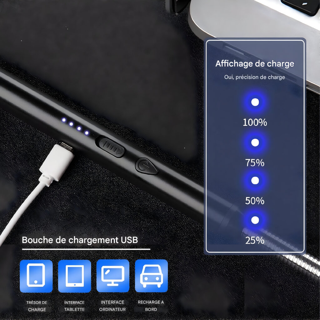 Rechargeable par USB et Écologique : Livré avec un câble USB, ce briquet se recharge facilement via n’importe quel port USB ou chargeur. Il fonctionne sans gaz, liquide ou flamme, offrant une solution pratique et respectueuse de l’environnement.