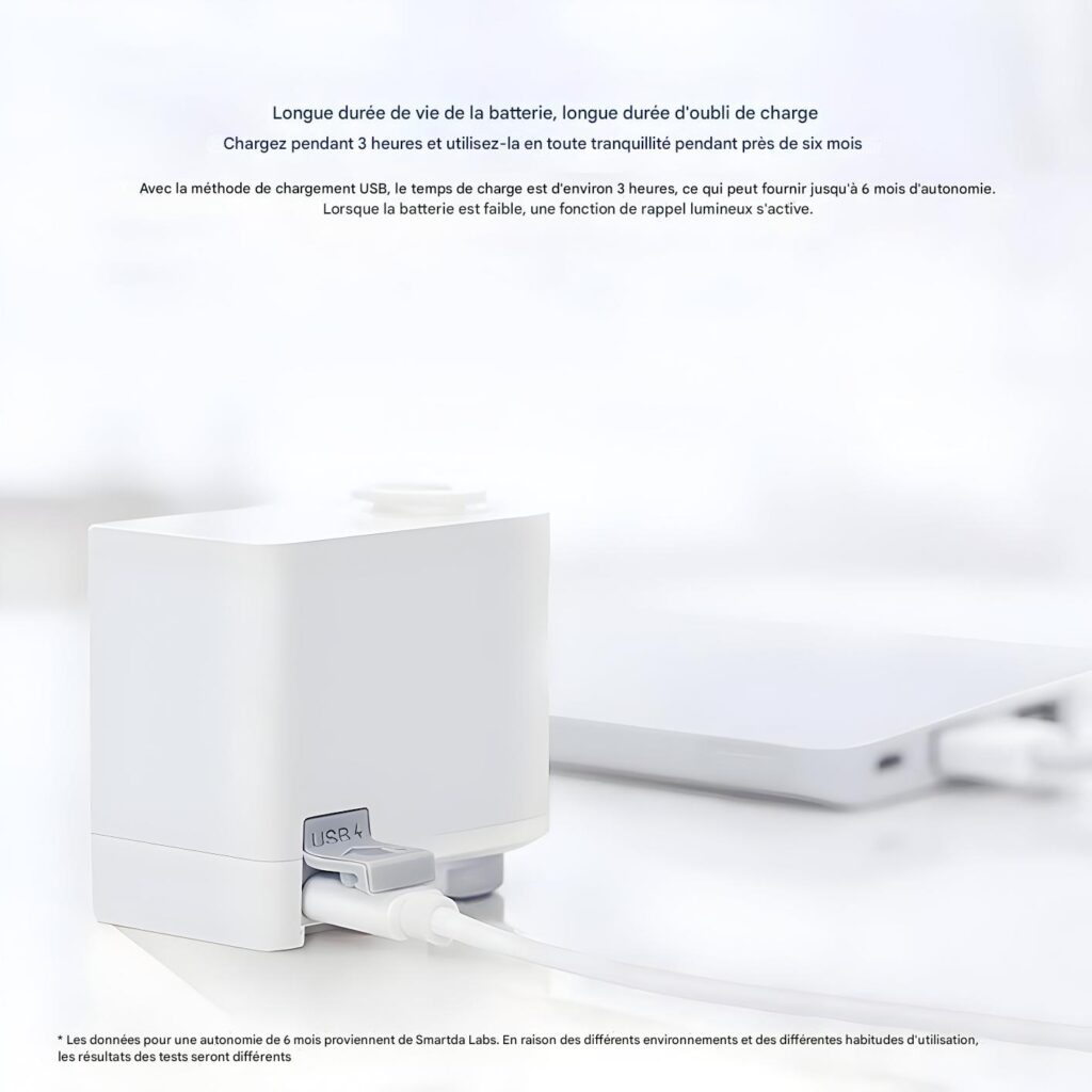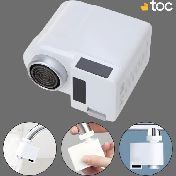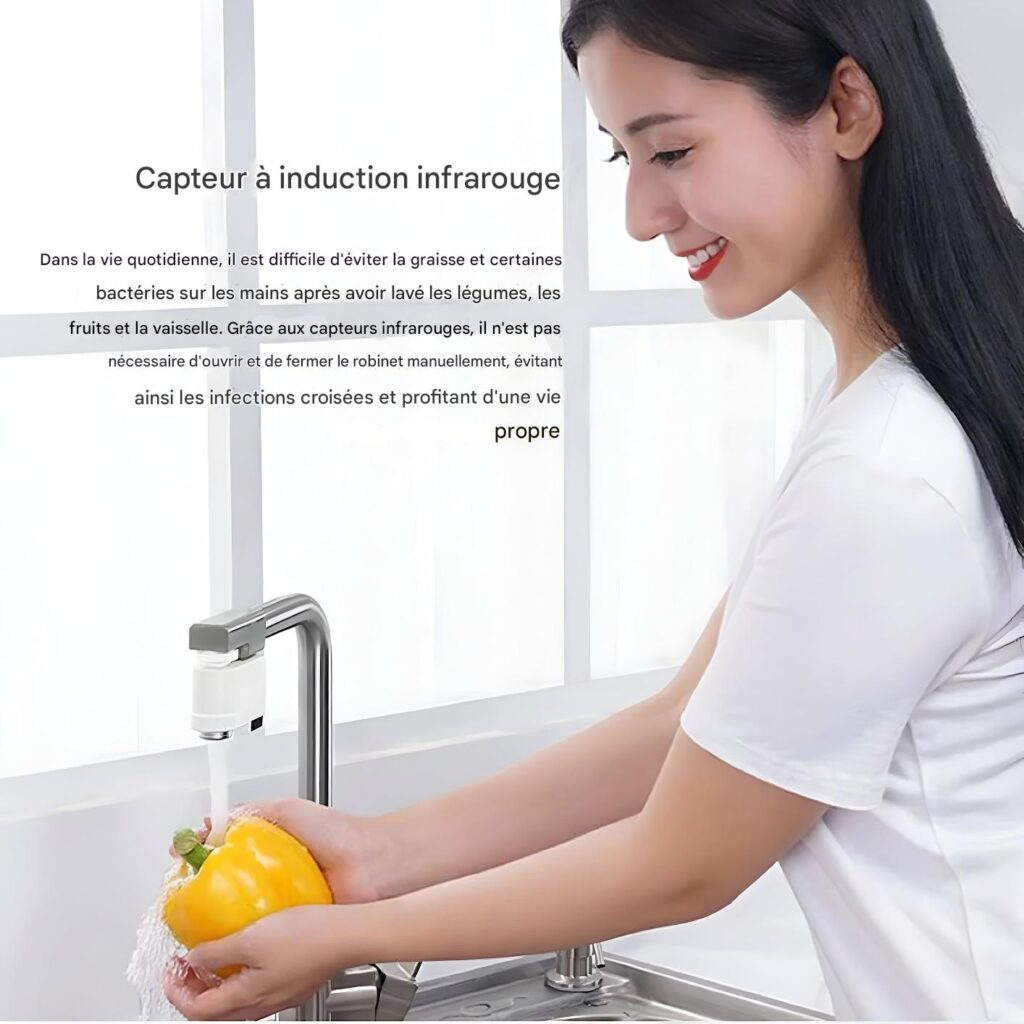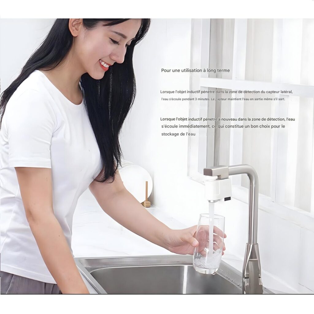 Installation Facile : Choisissez l’adaptateur adapté à votre robinet, fixez-le avec une rondelle, et insérez le dispositif (clic audible). Coupez l’eau avant installation. Rechargez le capteur via USB tous les 1-2 mois.