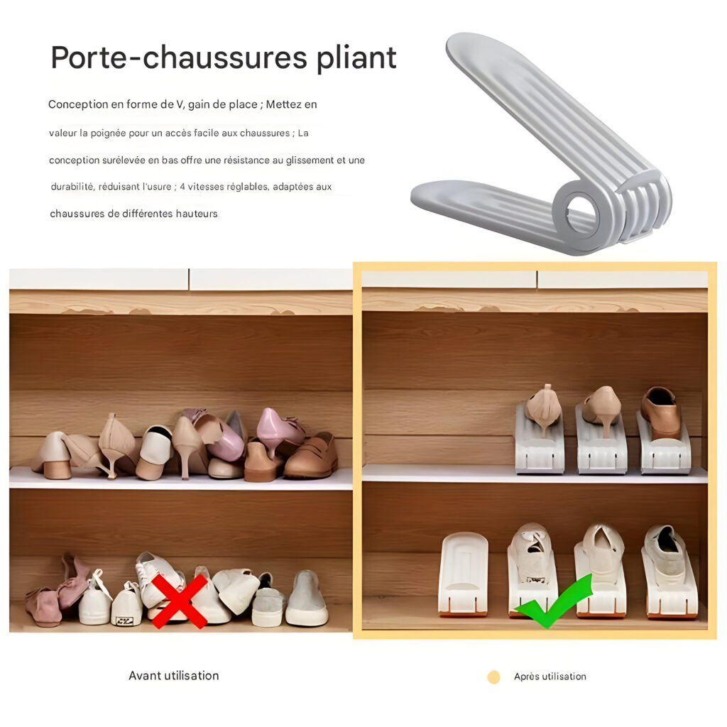 Adaptabilité aux Types de Chaussures : Avec ses deux hauteurs réglables, cette étagère s’ajuste facilement en fonction du type de chaussures, garantissant qu’elles ne soient ni compressées ni endommagées. Elle convient à une large gamme de chaussures, y compris les baskets, pantoufles, chaussures plates, chaussures pour enfants et talons hauts.