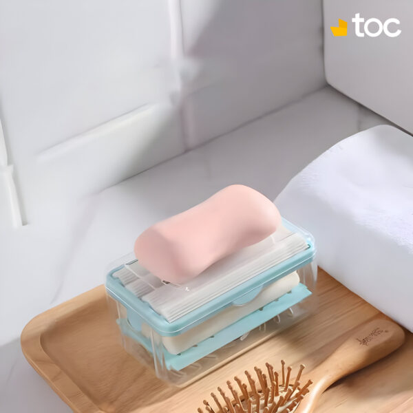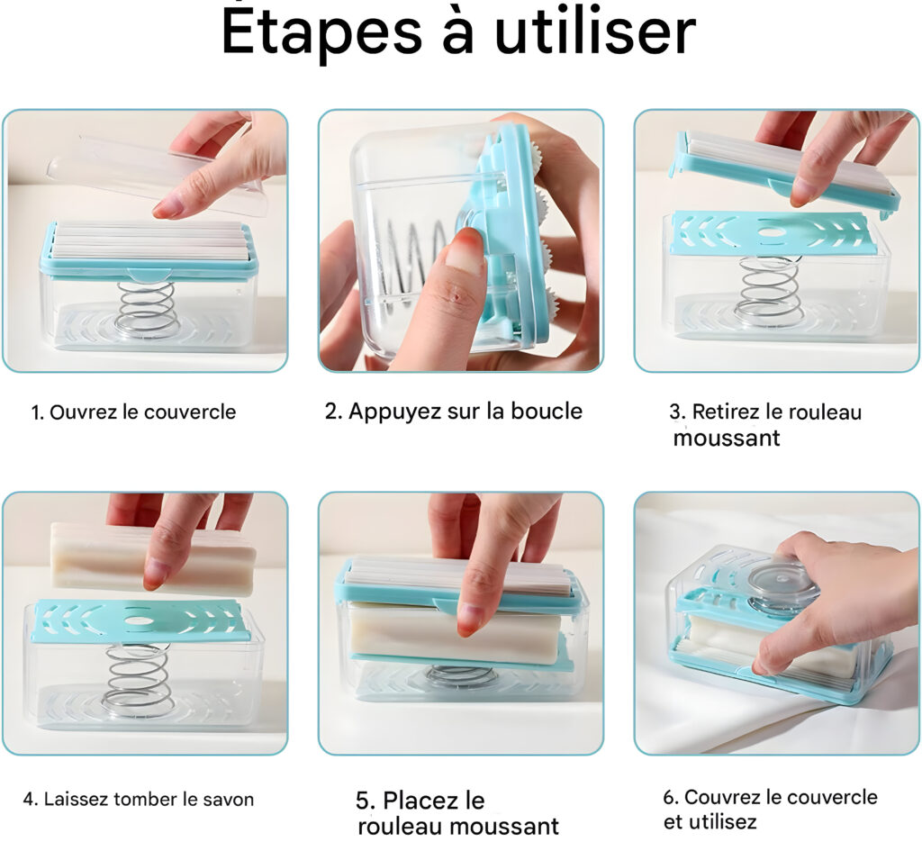 Porte-Savon Innovant : Ce porte-savon multifonctionnel combine lavage et rangement en un seul produit, tout en permettant une mousse rapide. Son fond équipé de ressorts facilite l’accès au savon, tandis que les rainures surélevées des rouleaux garantissent une utilisation aisée.