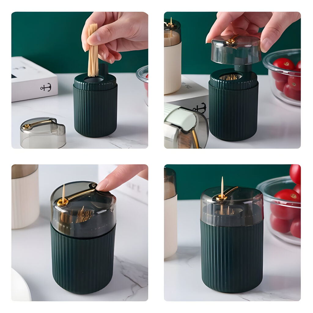 Distributeur Automatique de Cure-Dents : Profitez d’une manière simple et pratique de distribuer des cure-dents grâce à ce distributeur automatique. Il s’ouvre facilement par une légère pression, offrant une utilisation sans tracas. Disponible en trois couleurs attrayantes : vert foncé, vert clair et rouge, il apporte une touche de vitalité à votre espace tout en ajoutant une note de plaisir décontracté.