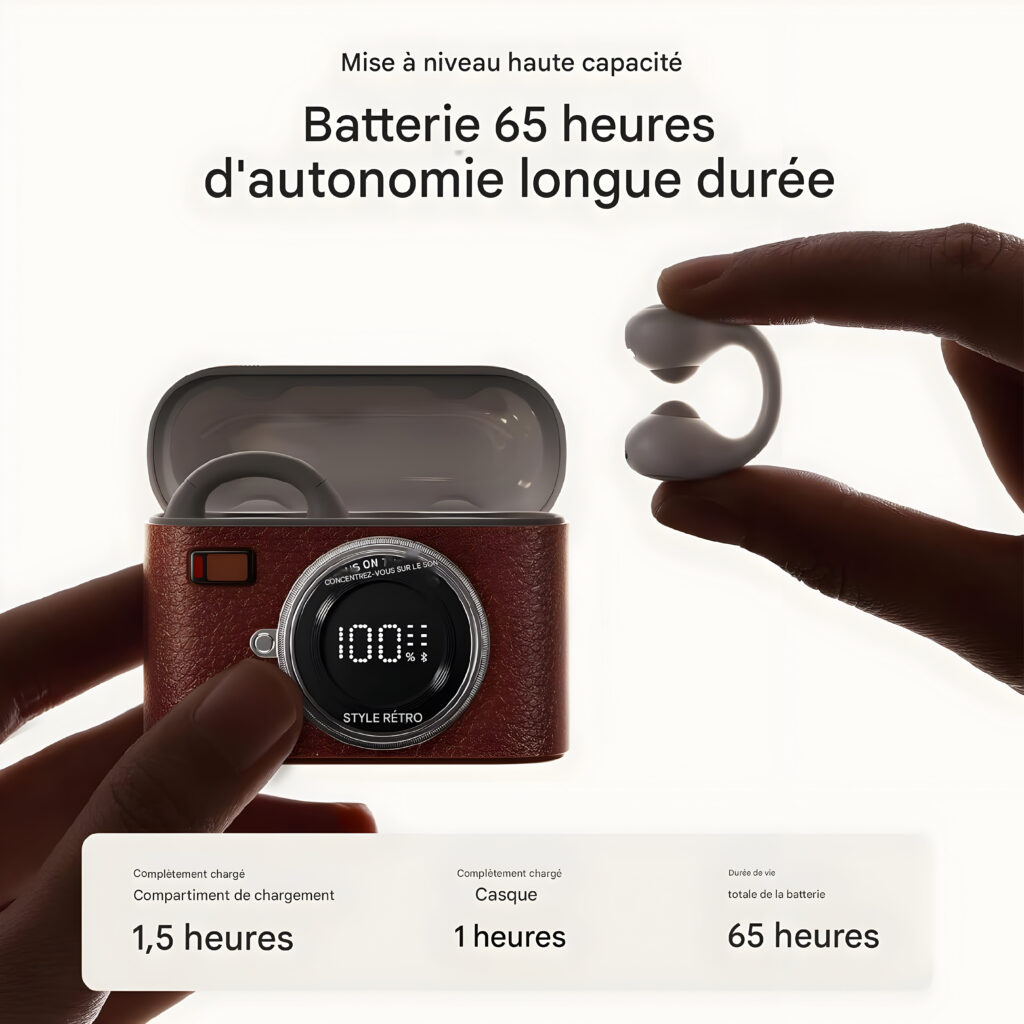 Autonomie et Étanchéité : Profitez de 6 heures d’écoute par oreille et jusqu’à 65 heures avec l’étui de chargement. Résistants à l’eau et à la transpiration, ils sont parfaits pour toutes vos activités.