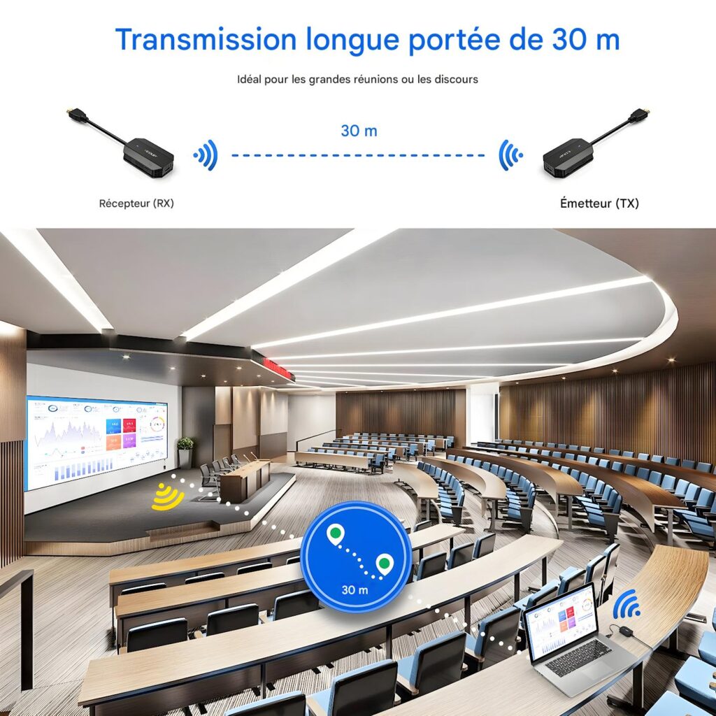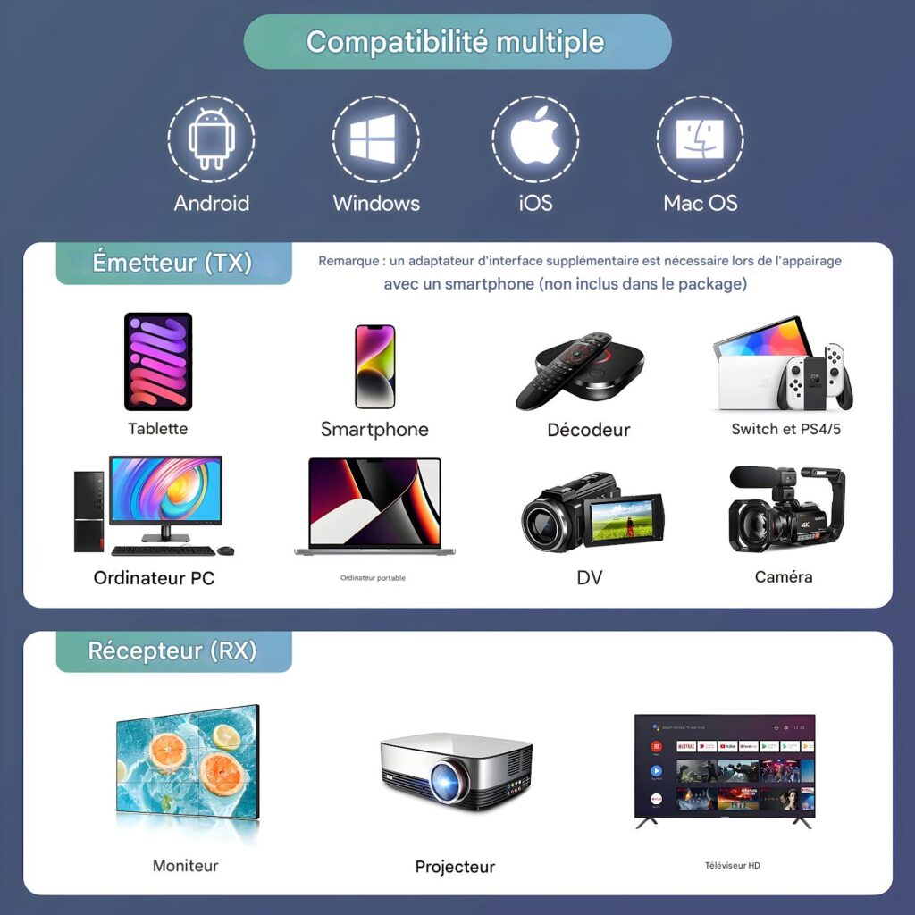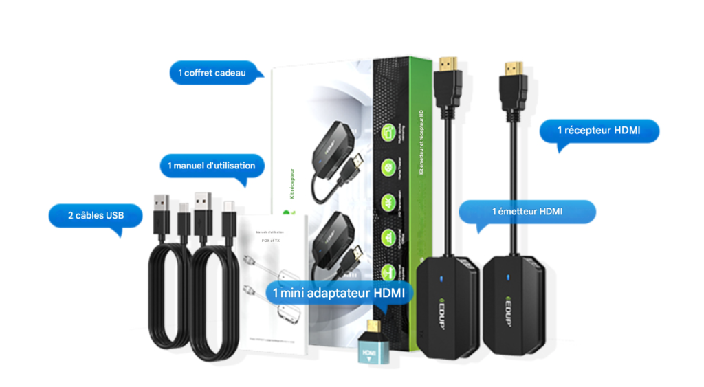 Installation Facile : Branchez TX à la source et RX à l’écran via câbles HDMI intégrés (100 mm), alimentez par USB-C. Connexion auto en 10-15 s. Inclut adaptateur Mini HDMI et 2 câbles USB-C 1 m.
