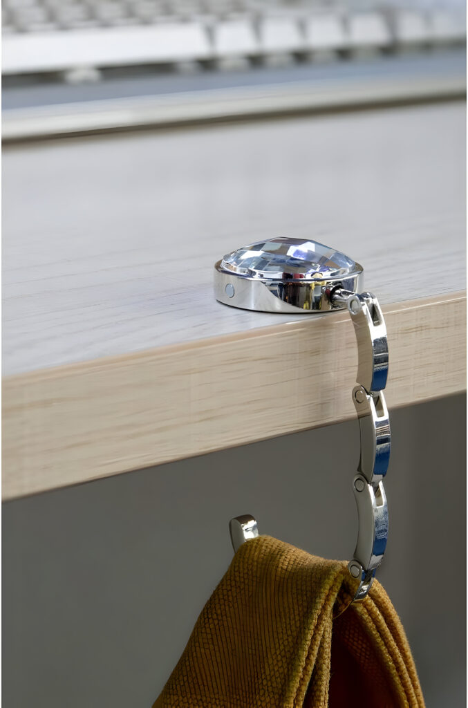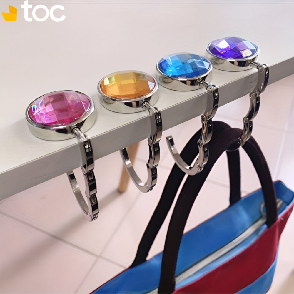 Matériau : Notre crochet de sac à main est conçu en alliage de zinc et orné de strass colorés. Chaque cintre est doté d’un dos en caoutchouc pour éviter tout glissement, avec un revêtement antidérapant qui protège votre sac des surfaces sales, telles que le sol ou les sièges.