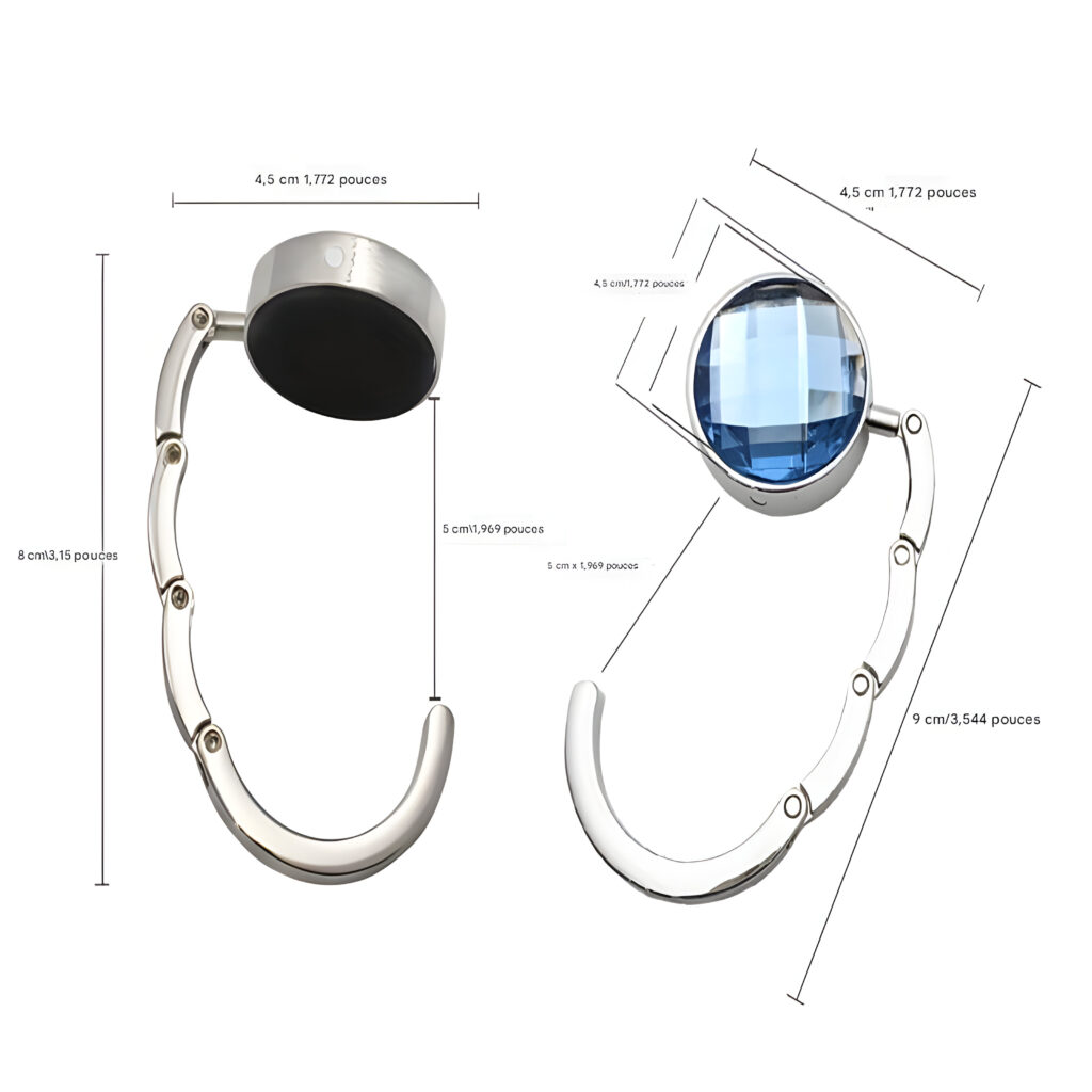 Compact et portable : Avec sa petite taille, ce crochet est facile à transporter partout sans alourdir votre sac. Ses dimensions sont de 4,5 x 1 cm (largeur x hauteur) lorsqu’il est plié, et il mesure 9 cm de long lorsqu’il est déplié.