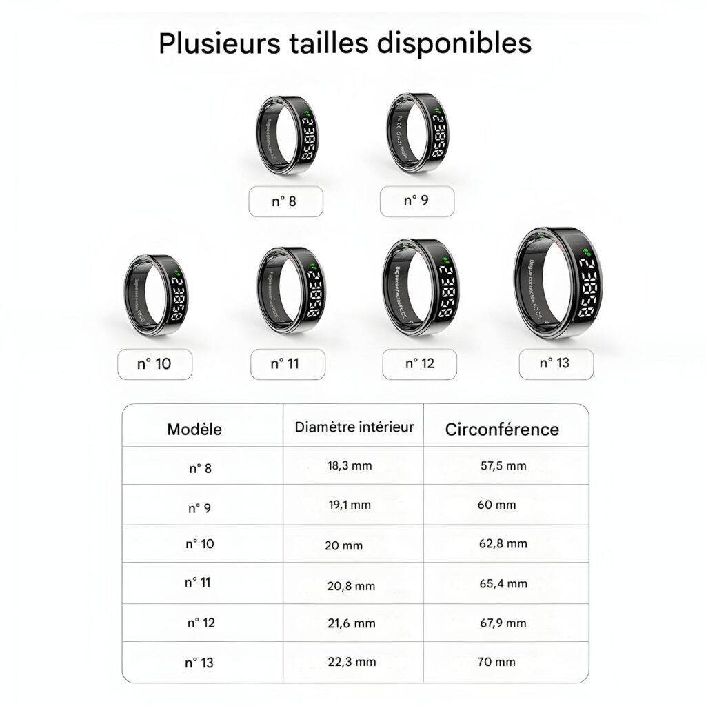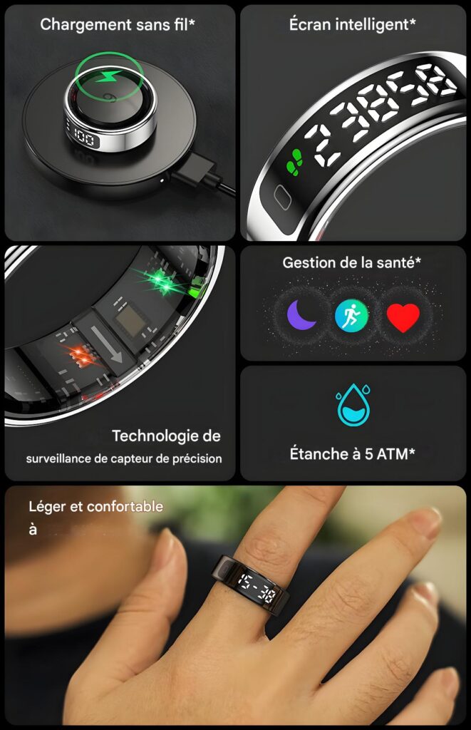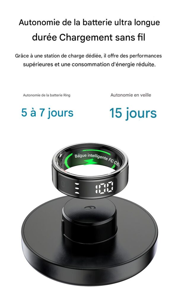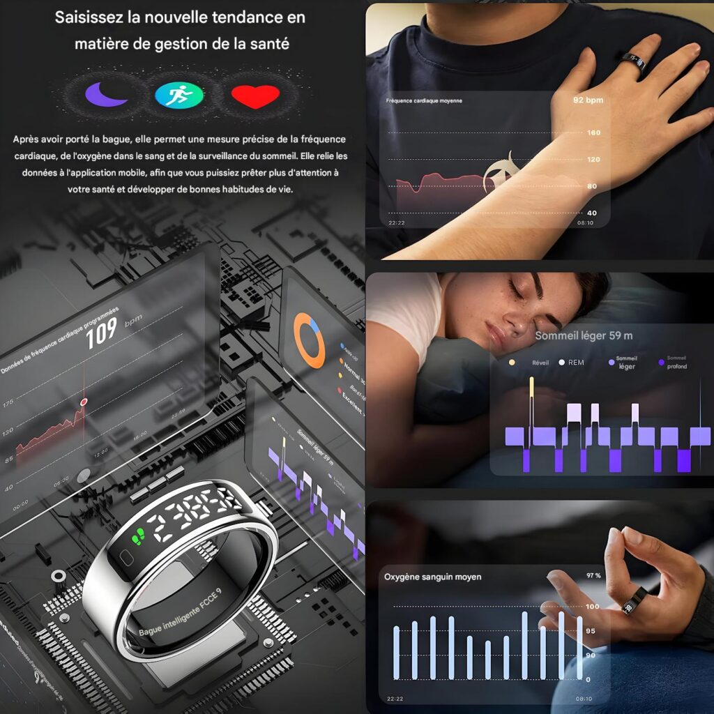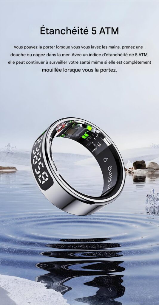 Compatibilité : App gratuite QRing (iOS 8.0+, Android 5.1+), accéléromètre et capteur cœur intégrés.
