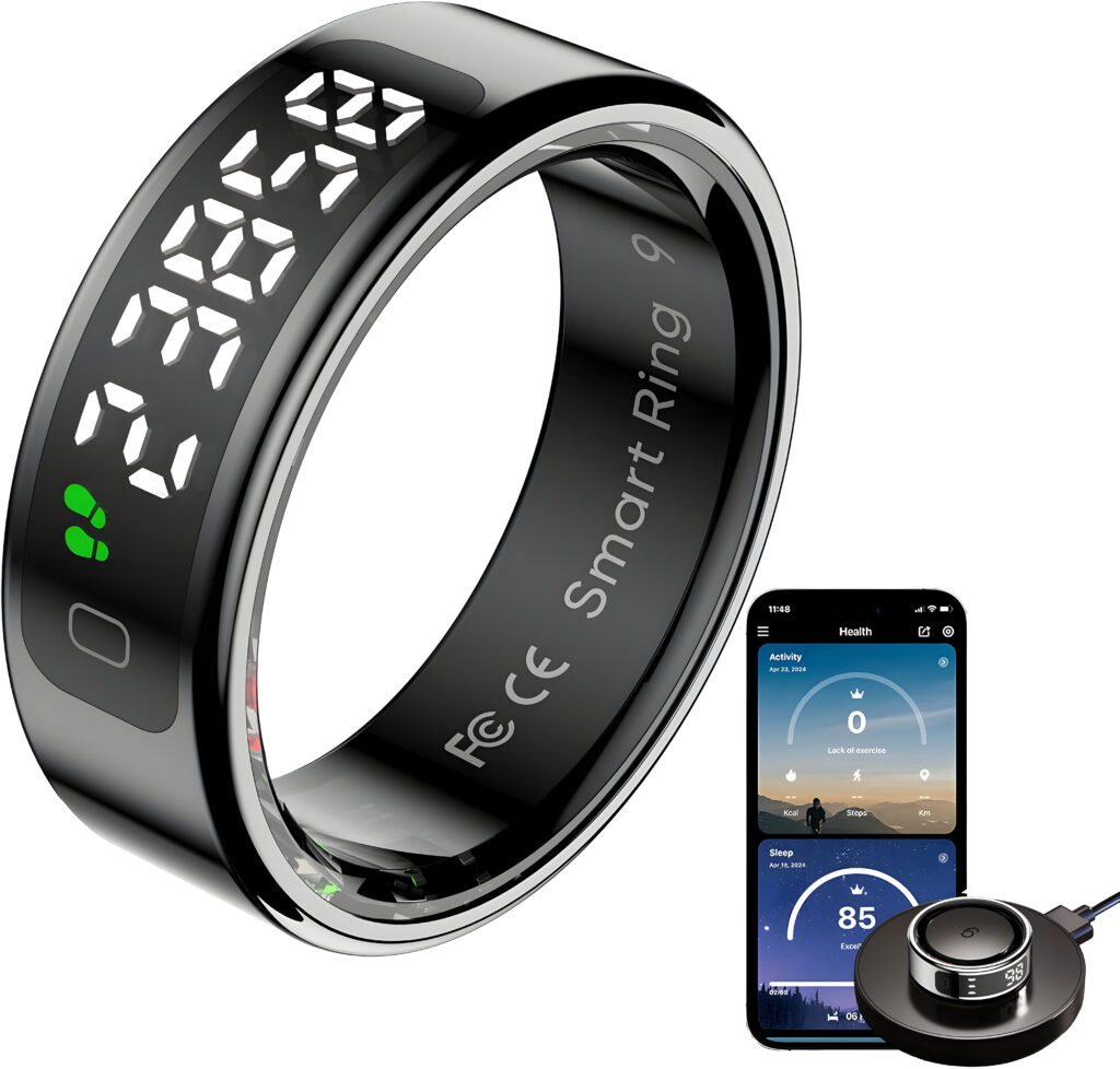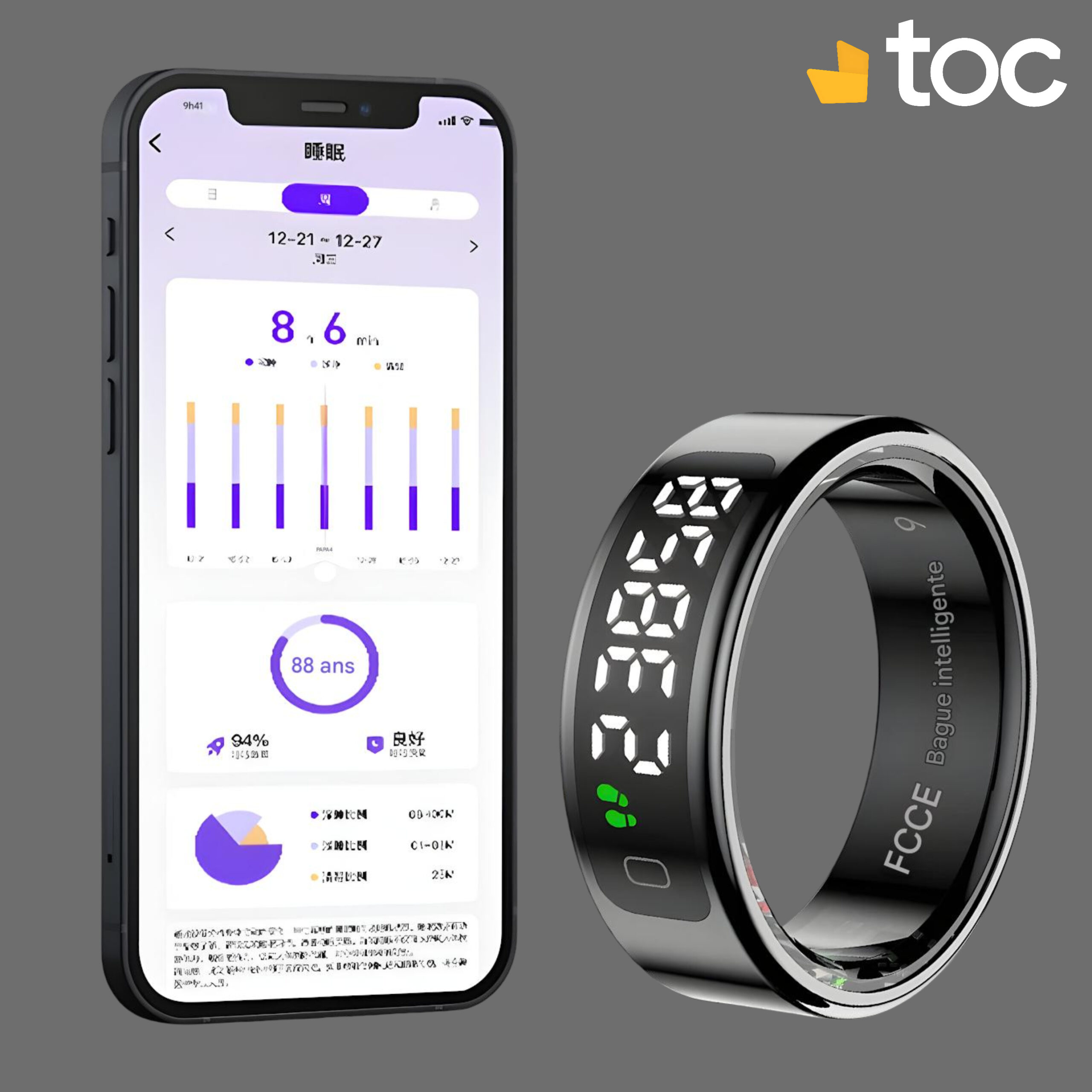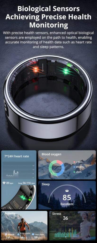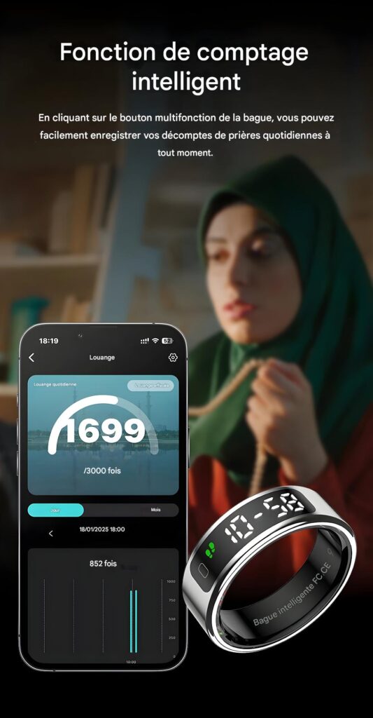 Compatibilité : App gratuite QRing (iOS 8.0+, Android 5.1+), accéléromètre et capteur cœur intégrés.