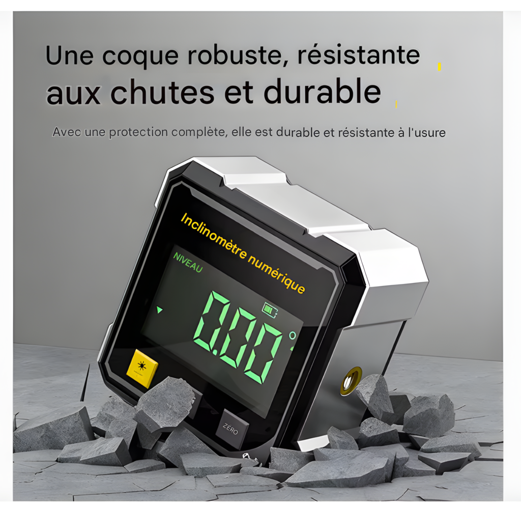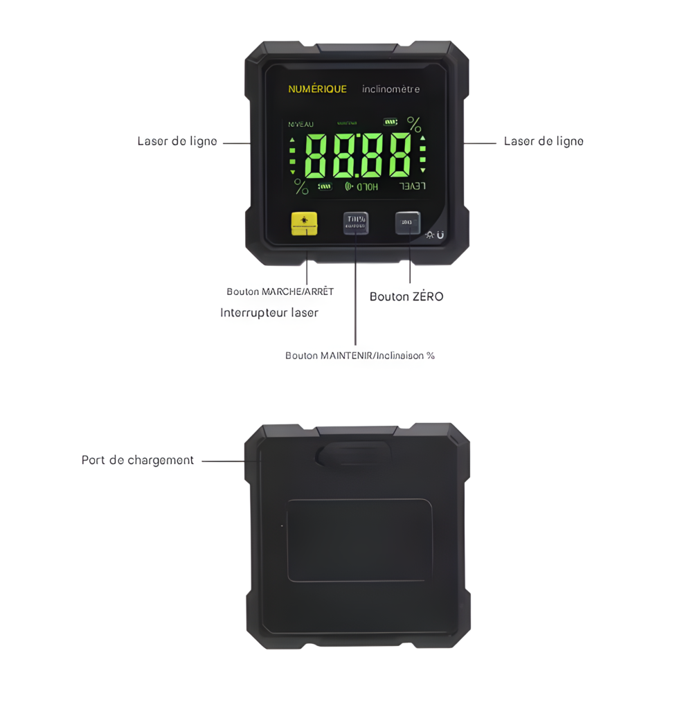 Matériel et autonomie : Conçu pour un usage professionnel avec un corps robuste en alliage d’aluminium, cet inclinomètre numérique allie solidité et légèreté. Alimenté par une batterie lithium rechargeable avec une tension d’opération ≤36V, il offre une autonomie fiable pour une journée de travail. Son design compact et ergonomique facilite la prise en main et garantit une utilisation confortable sur le terrain.