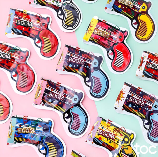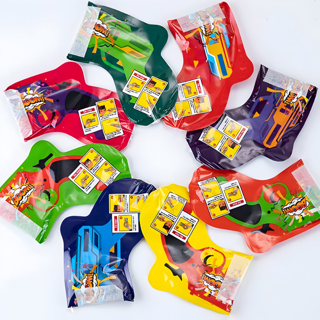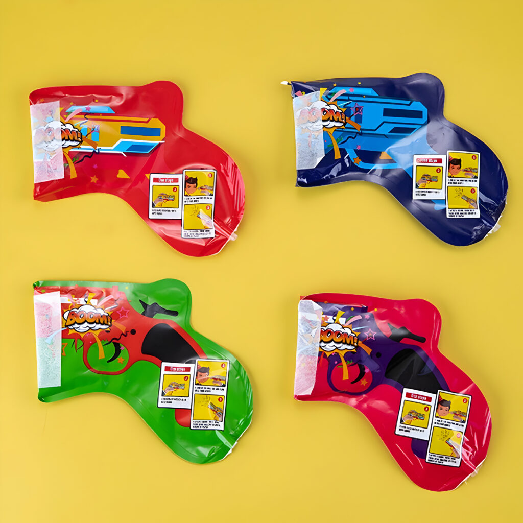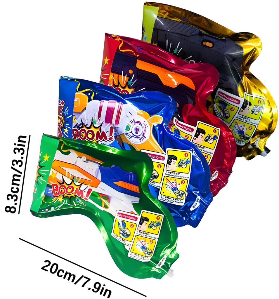 Présentation du Produit : Chaque unité en forme de pistolet (17 x 14,5 cm gonflé, 16 x 6 cm dégonflé, 7,7 g) inclut une capsule d’eau intérieure pour gonflage, une poignée ergonomique et des confettis intégrés multicolores avec motifs Boom. Design festif et compact pour un transport aisé.