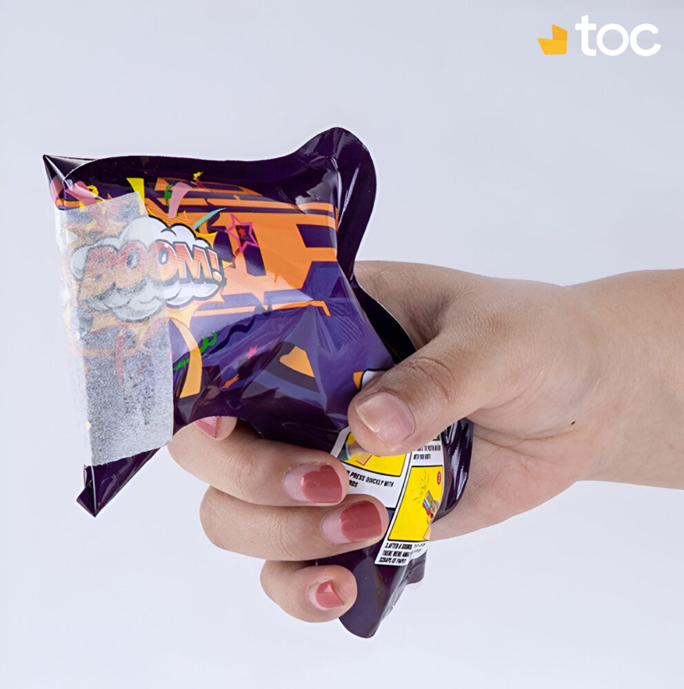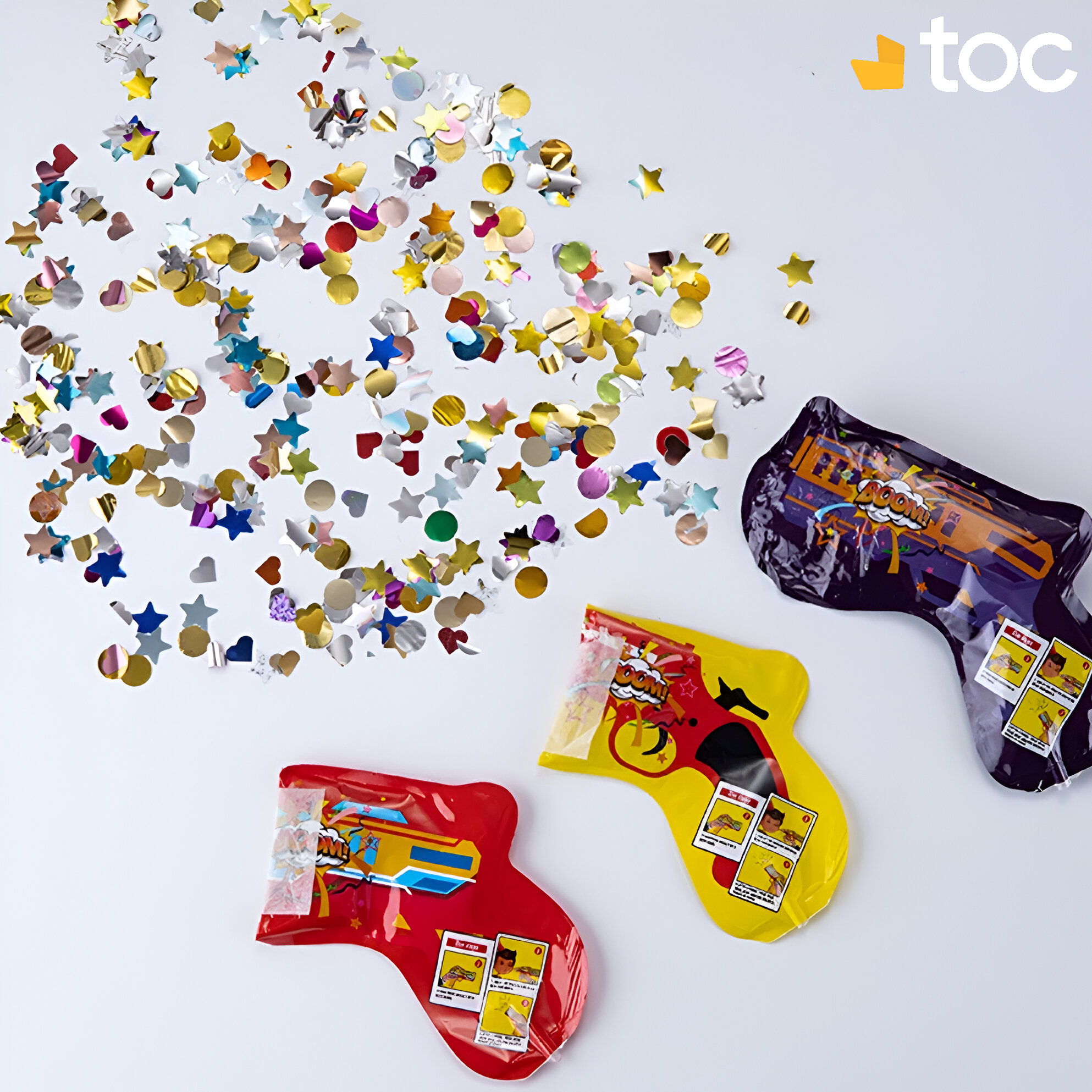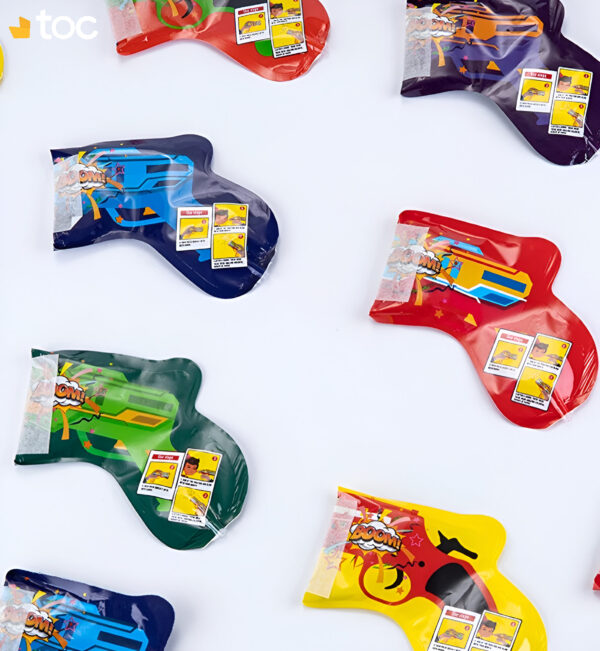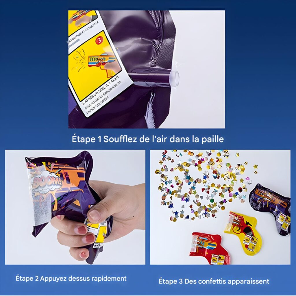 Présentation du Produit : Chaque unité en forme de pistolet (17 x 14,5 cm gonflé, 16 x 6 cm dégonflé, 7,7 g) inclut une capsule d’eau intérieure pour gonflage, une poignée ergonomique et des confettis intégrés multicolores avec motifs Boom. Design festif et compact pour un transport aisé.