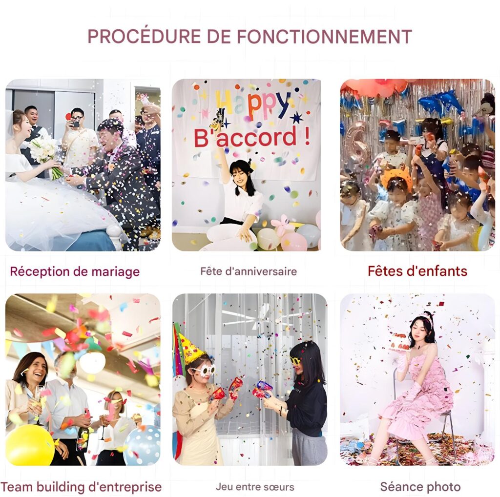 Mode d’Emploi : Brisez le sachet d’eau pour gonfler (15-30 s), secouez pour mélanger les confettis. Pincez le ballon et pressez la poignée pour propulser. Utilisez en extérieur pour un effet optimal ; jetez les résidus biodégradables après usage.